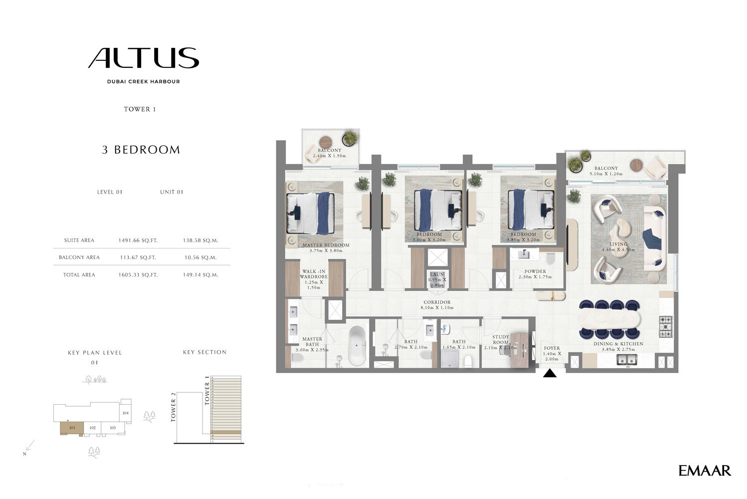 ALTUS, a premium waterfront complex by Emaar Properties in Dubai Creek Harbour, features two towers offering a diverse selection of meticulously designed 1-3 bedroom apartments. Property sizes range from 665 sq. ft to 1,927 sq. ft, with layouts including balconies and laundry rooms. The 2 and 3-bedroom apartments also feature walk-in wardrobes and storage rooms, while the 3-bedroom units include studies.